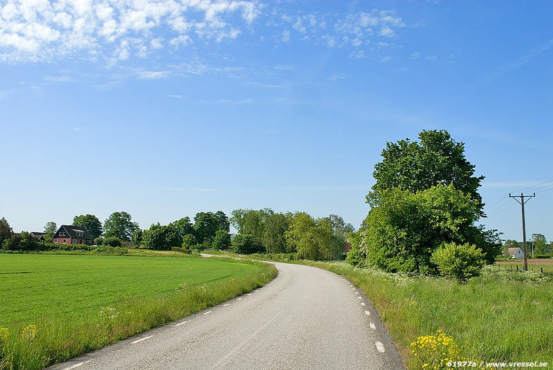 Från norr (Övedskloster) dyker byn upp efter en lång raksträcka.